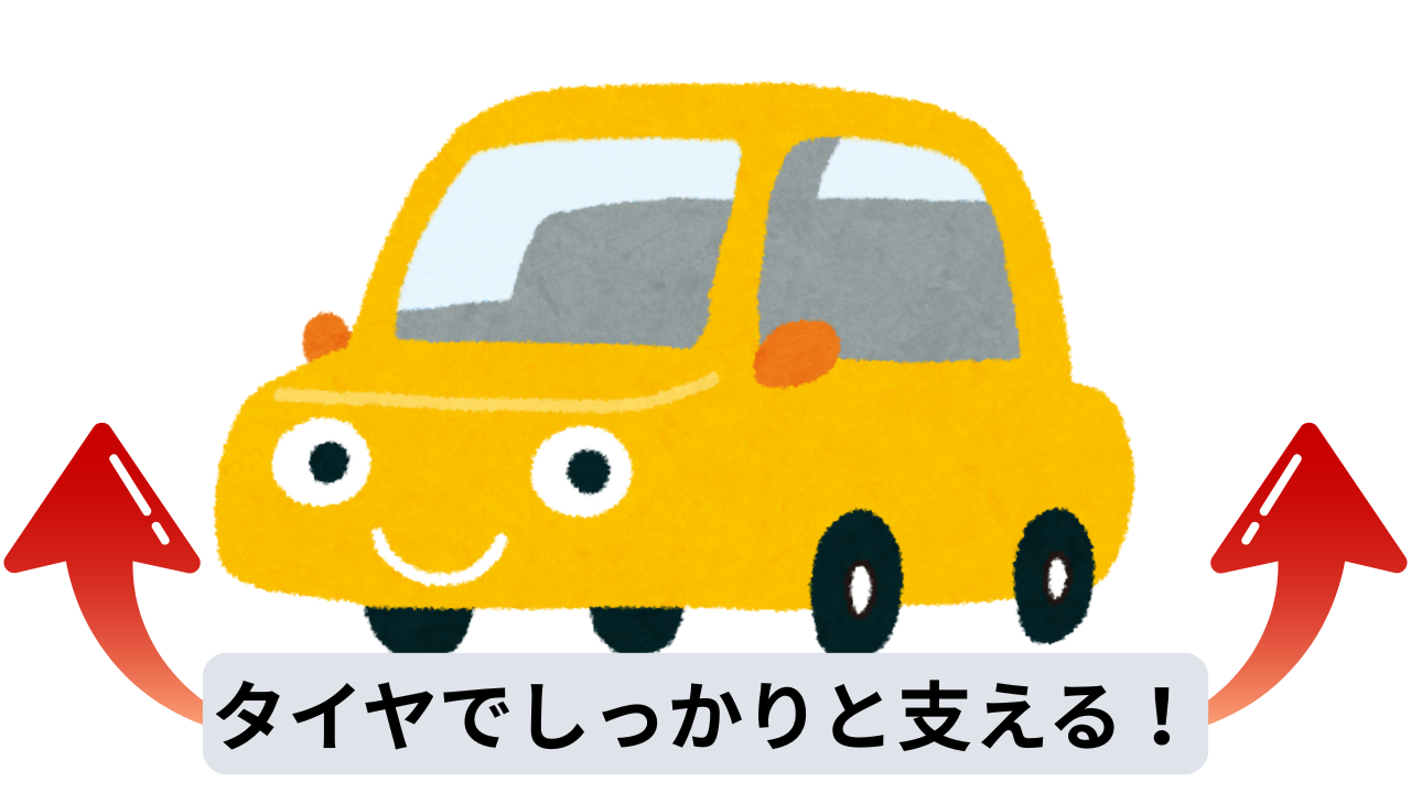 一般的な乗用車ですと、タイヤ4本でしっかりと支えてくれています。