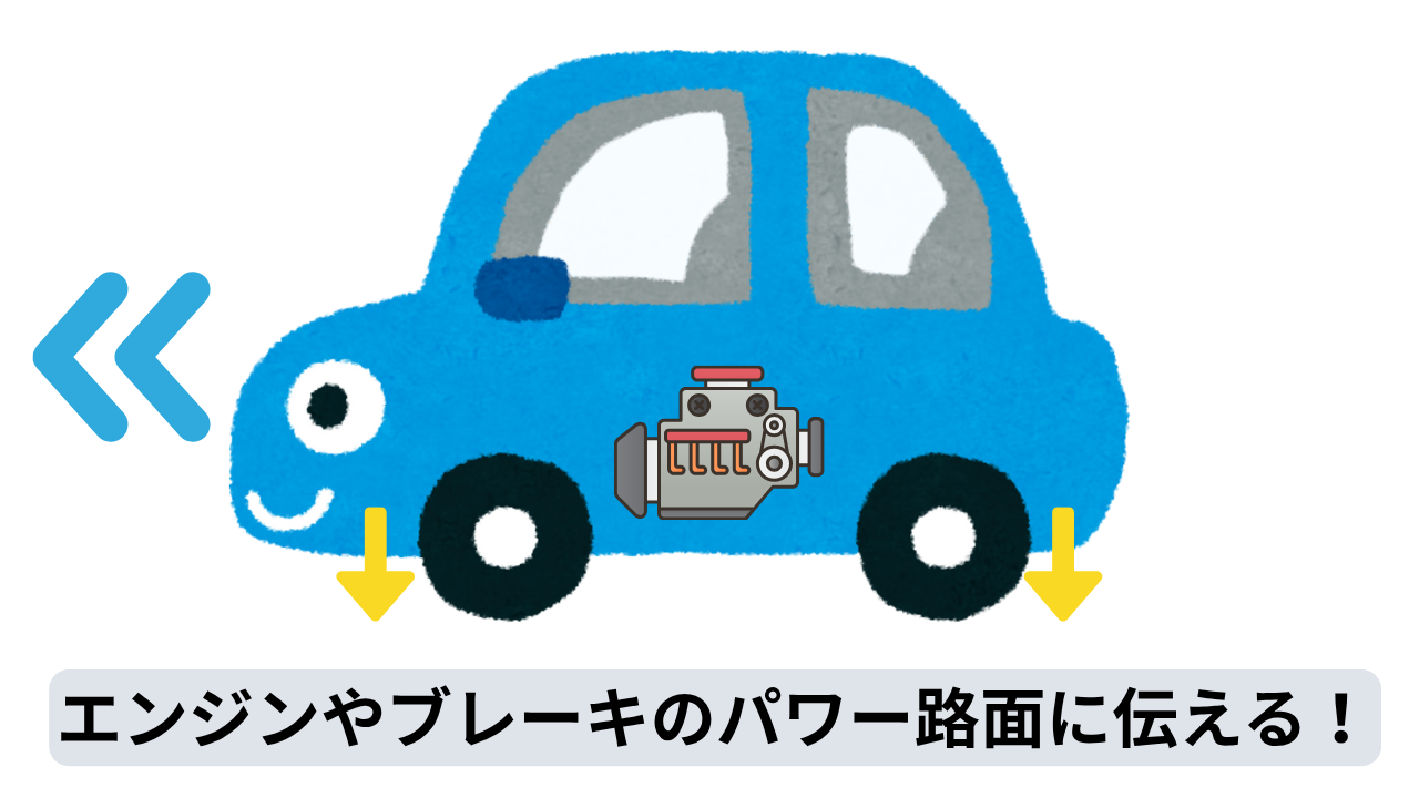 エンジンやブレーキのパワーを、路面に伝えて車を進めたり止めたりする役割。