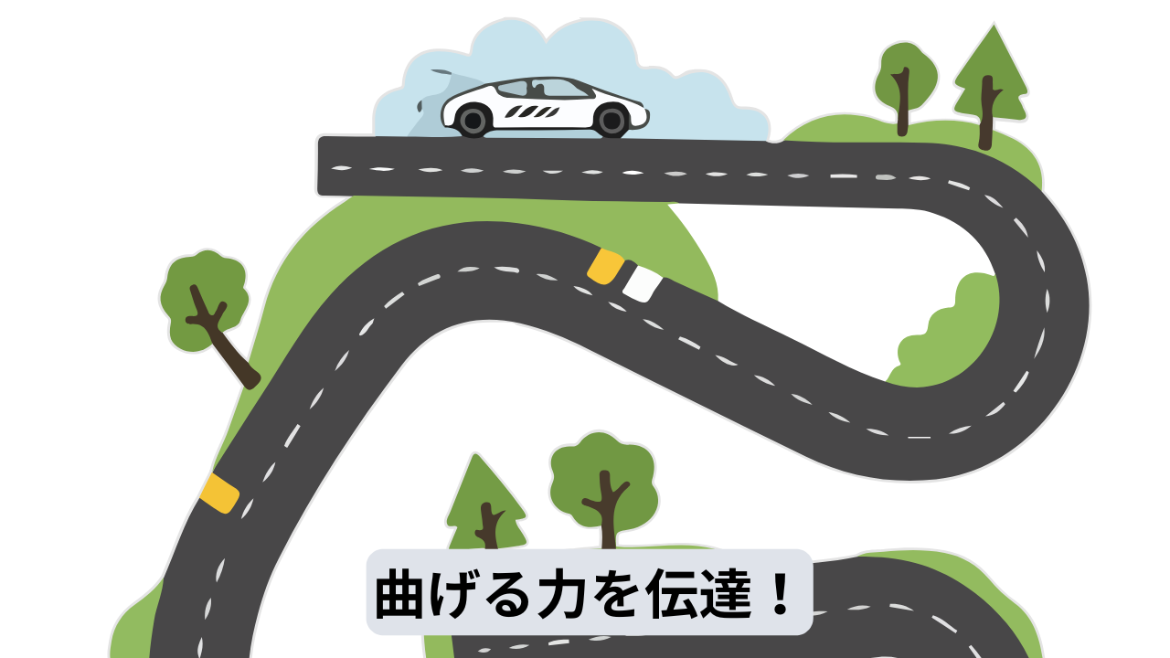 車の方向を変えるために必要なハンドル操作ですが、ハンドルから伝わった曲げる力をタイヤへ伝達することで車は方向転換することができます。