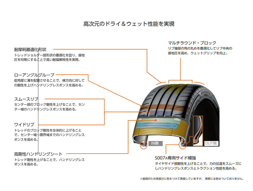 しかしPOTENZA S007Aは、タイヤのパタンを工夫することで、スポーティーな走りを損なうことなく、どちらの性能も高いレベルにて両立できるタイヤを実現できるようになりました。