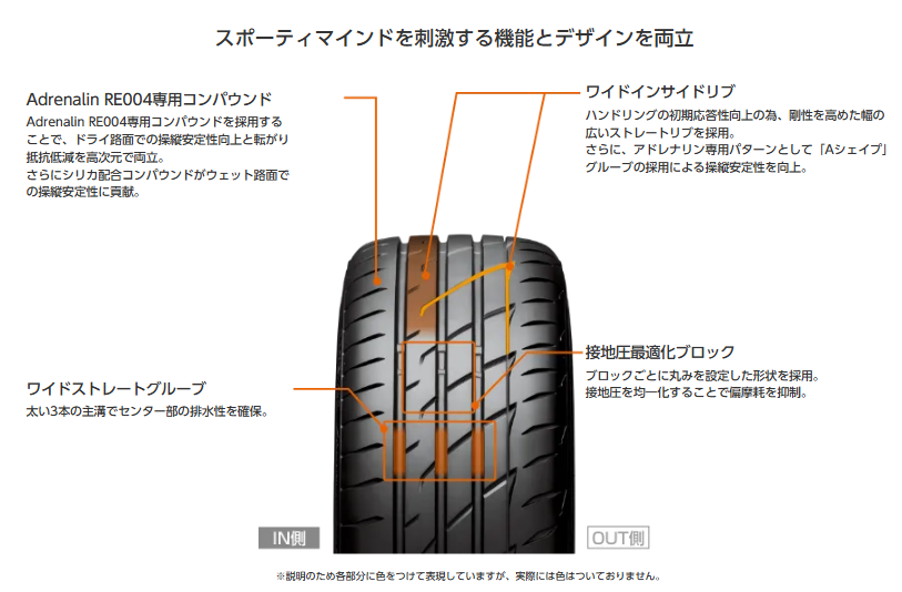 POTENZA Adrenalin RE004 「専用」のコンパウンドを採用することで、ドライ面での操縦安定性の向上と、転がり抵抗低減を高次元で両立しています。