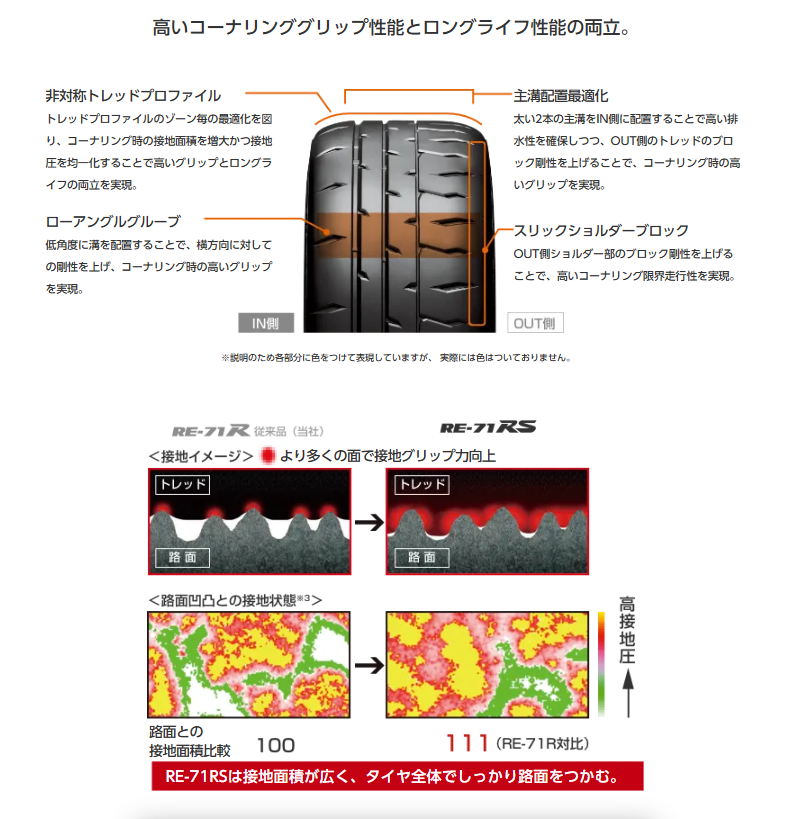 「速く走れるタイヤ=擦り減りが早い」というイメージですが、POTENZA RE-71RSはコーナリング時の接地面積を均一かつ増やす事で高い耐摩耗性を実現しています。耐摩耗性が高いので、スポーツタイヤでありながら経済的にも優しいタイヤなのです。