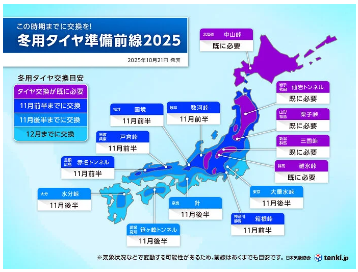 日本気象協会から、2025年度の「冬用タイヤ準備前線」が発表されました。