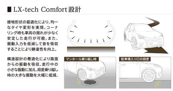タイヤの接地形状を最適化するための「LX-tech Comfort設計」が新たに採用され、旧モデルの強みでもあった走行中の小さな振動の吸収をさらに向上し、凸凹のある路面を乗り越える際の衝撃も吸収することで、より上質な乗り心地を実現しています。