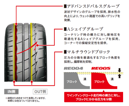 旧モデル「RE-71RS」の性能を継承しつつ、公道のみならずサーキットでも圧倒的な走行性能と安定したコントロール性能を発揮することができるタイヤです。