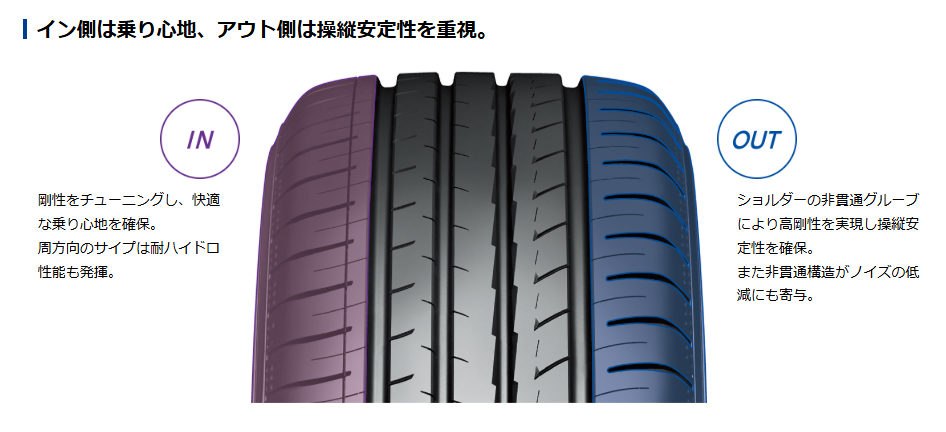 また非対象のトレッドパターンのIN側では、路面からの衝撃を吸収することで快適性も確保しています。